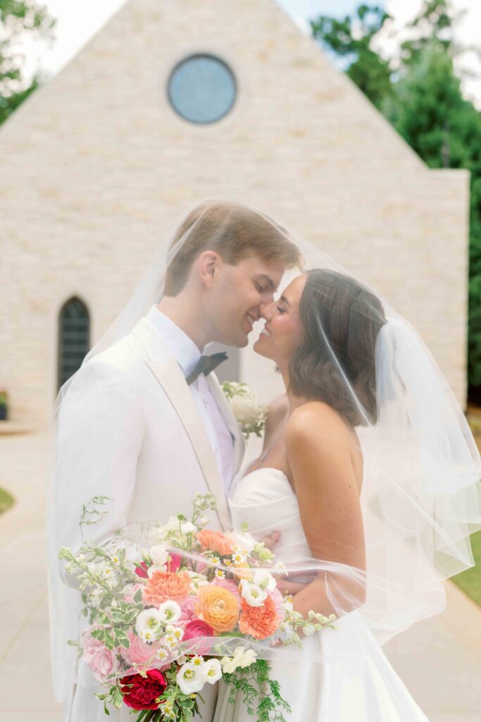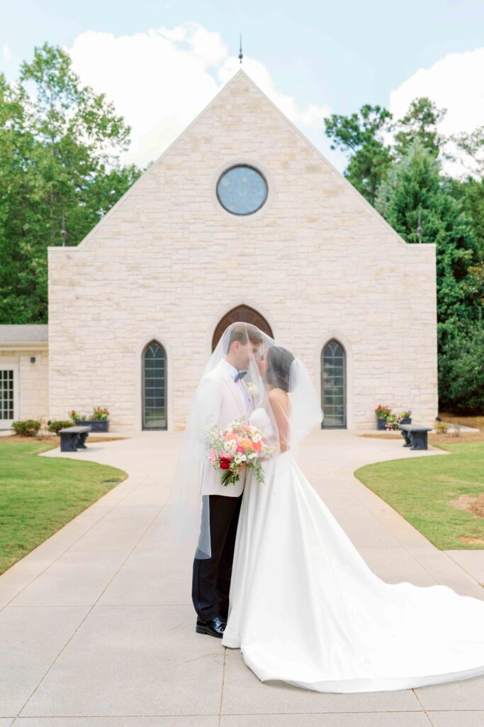 Additionally, the florals framed the altar beautifully and highlighted the chapel’s clean architectural lines. Together, the design created a romantic atmosphere that flowed seamlessly throughout the wedding day.