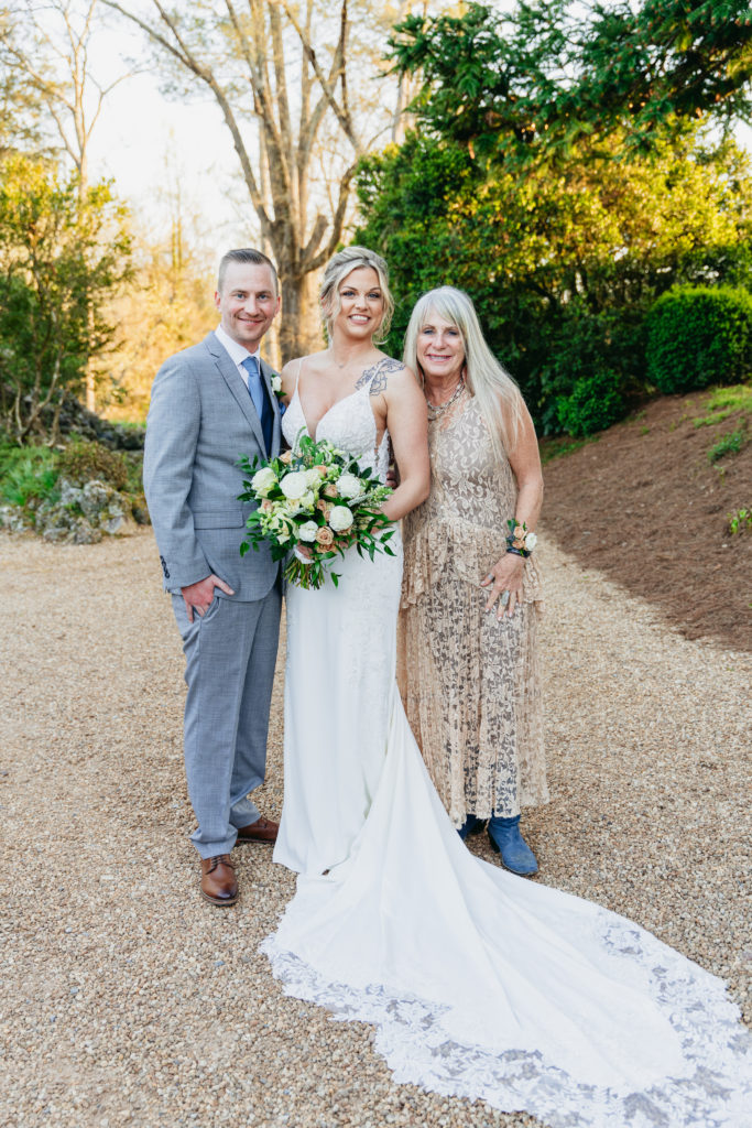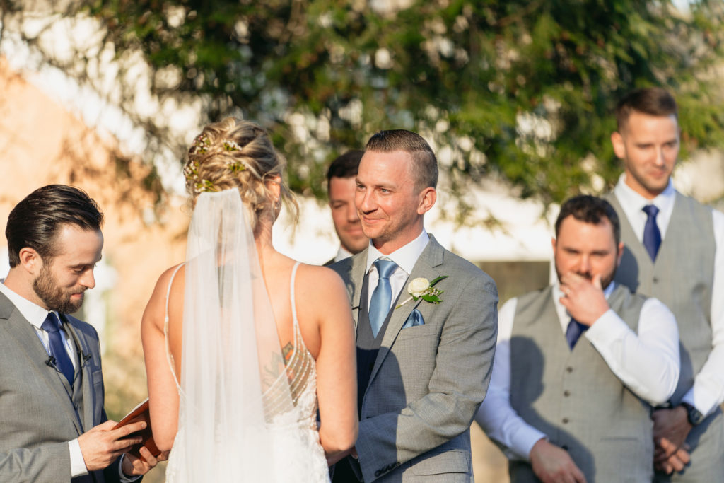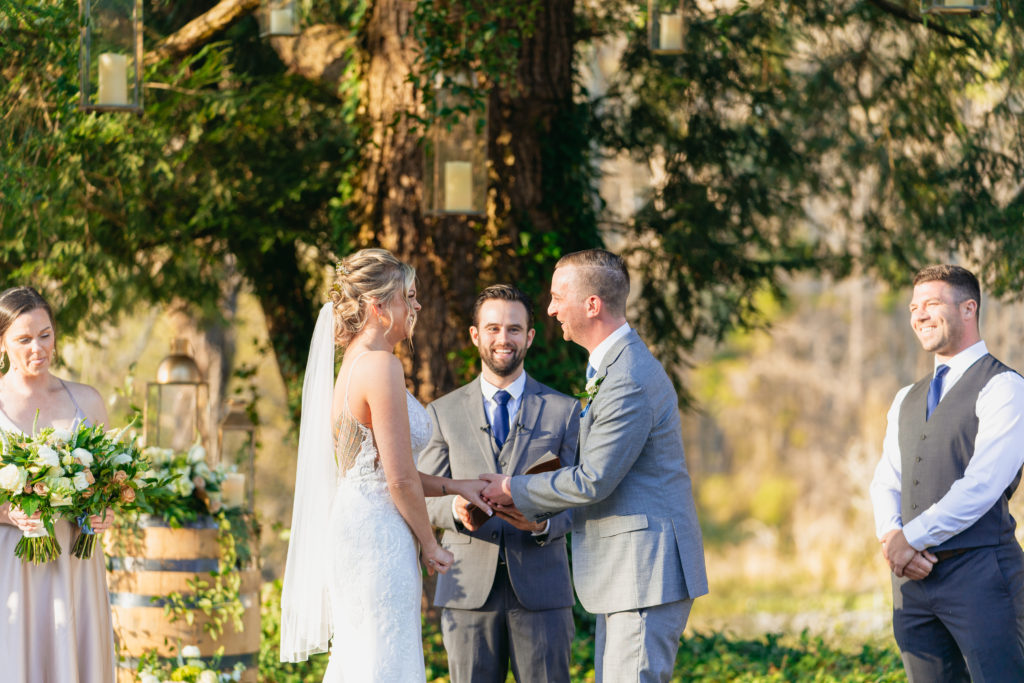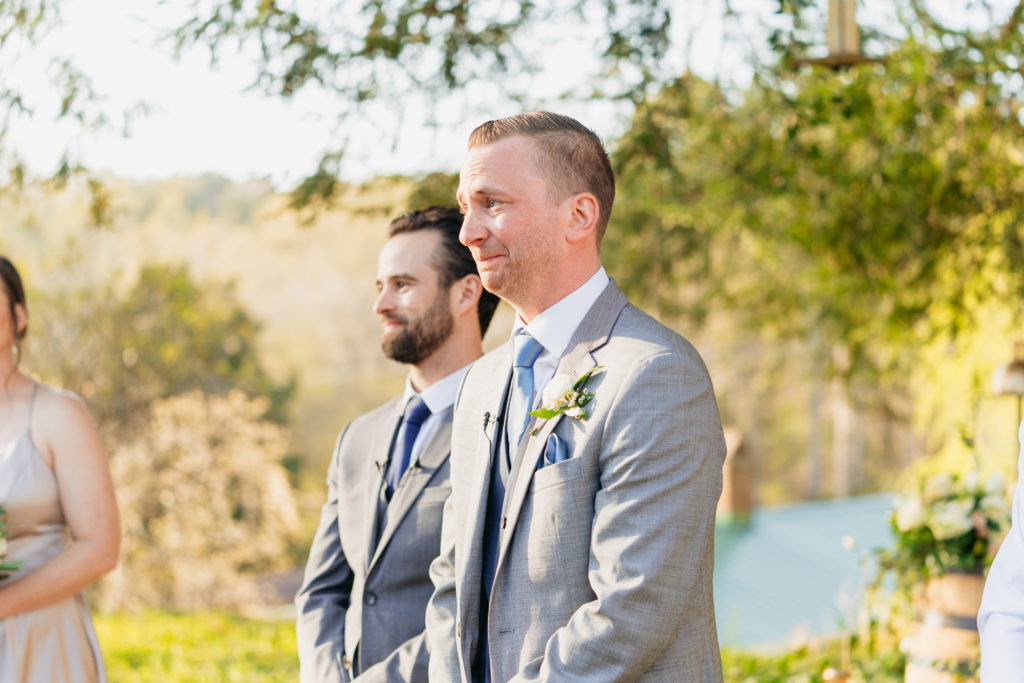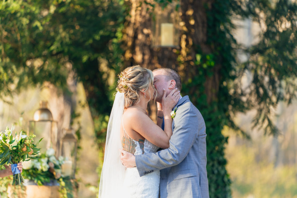 Her bridal bouquet was simple yet timeless, featuring peach roses, white ranunculus, and lush greenery. Meanwhile, Taylor looked dapper in a gray suit, styled with a navy vest, light blue tie, and a single white ranunculus boutonnière. Their wedding attire perfectly reflected the elegant yet relaxed vibe of their countryside wedding.