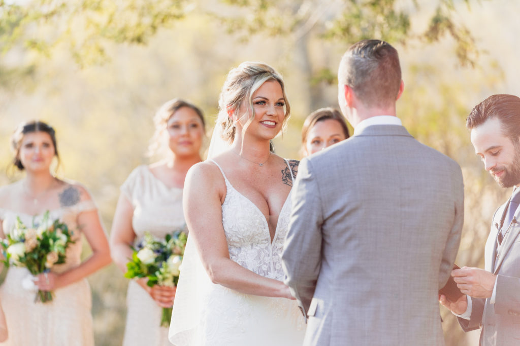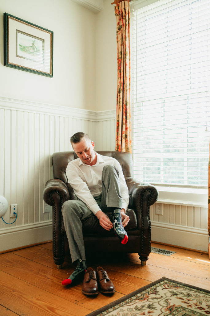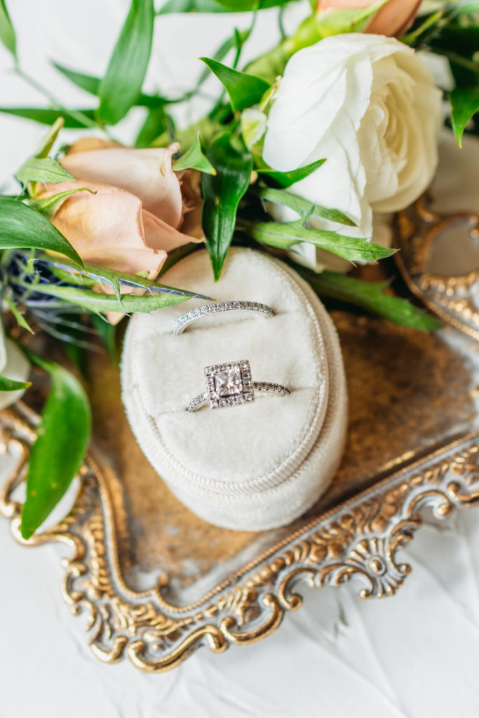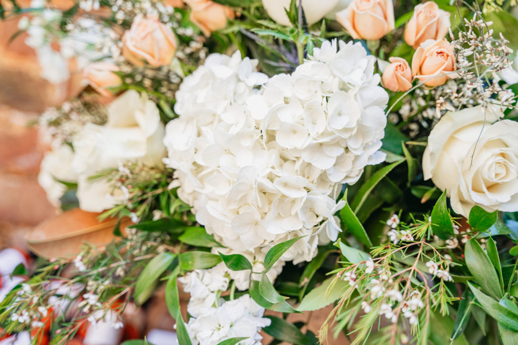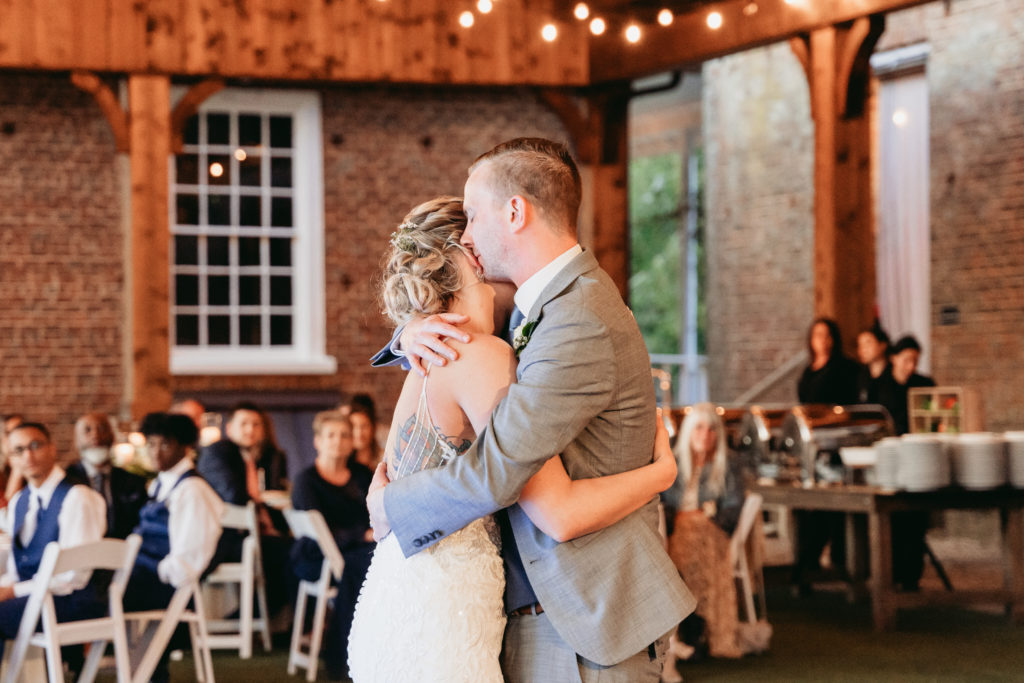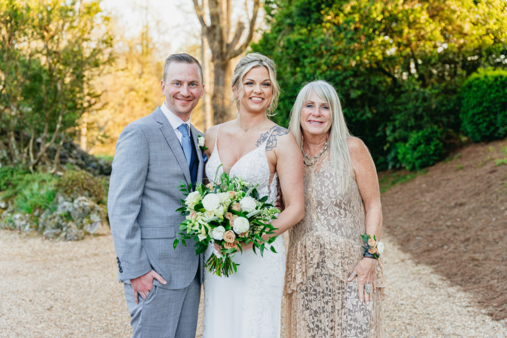 Her bridal bouquet was simple yet timeless, featuring peach roses, white ranunculus, and lush greenery. Meanwhile, Taylor looked dapper in a gray suit, styled with a navy vest, light blue tie, and a single white ranunculus boutonnière. Their wedding attire perfectly reflected the elegant yet relaxed vibe of their countryside wedding.