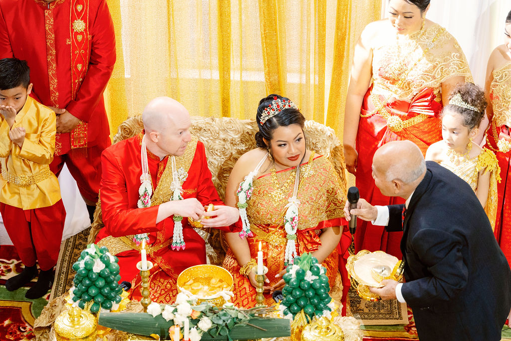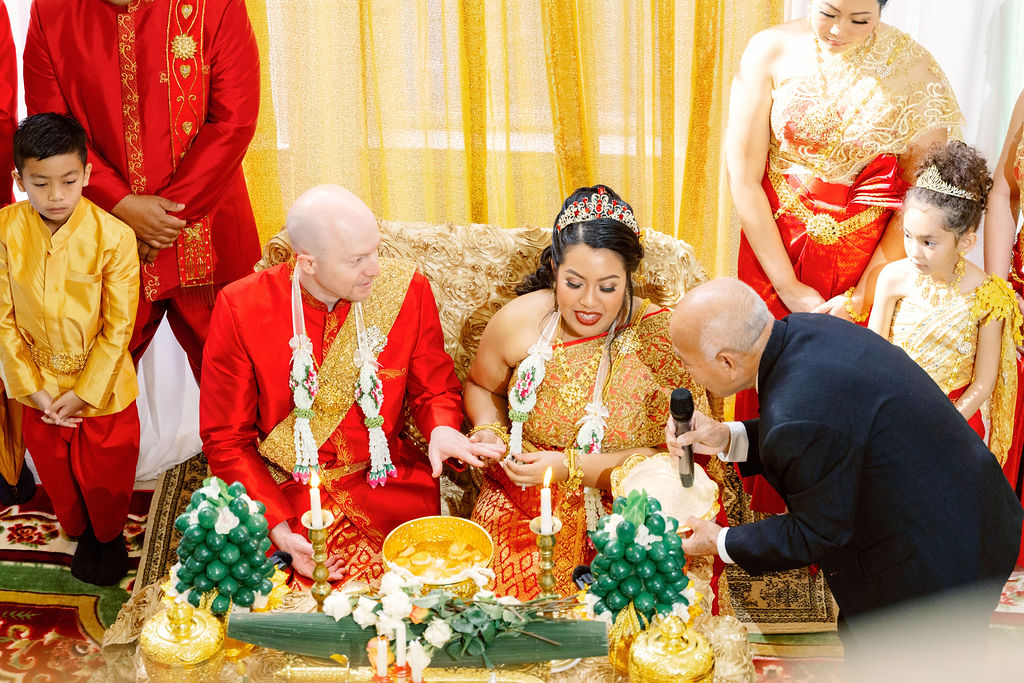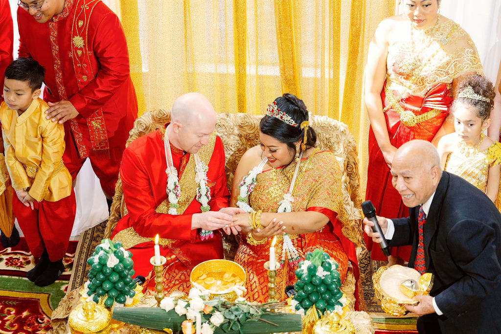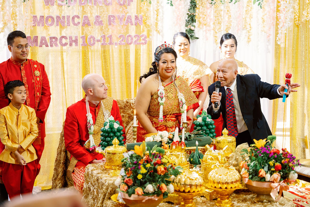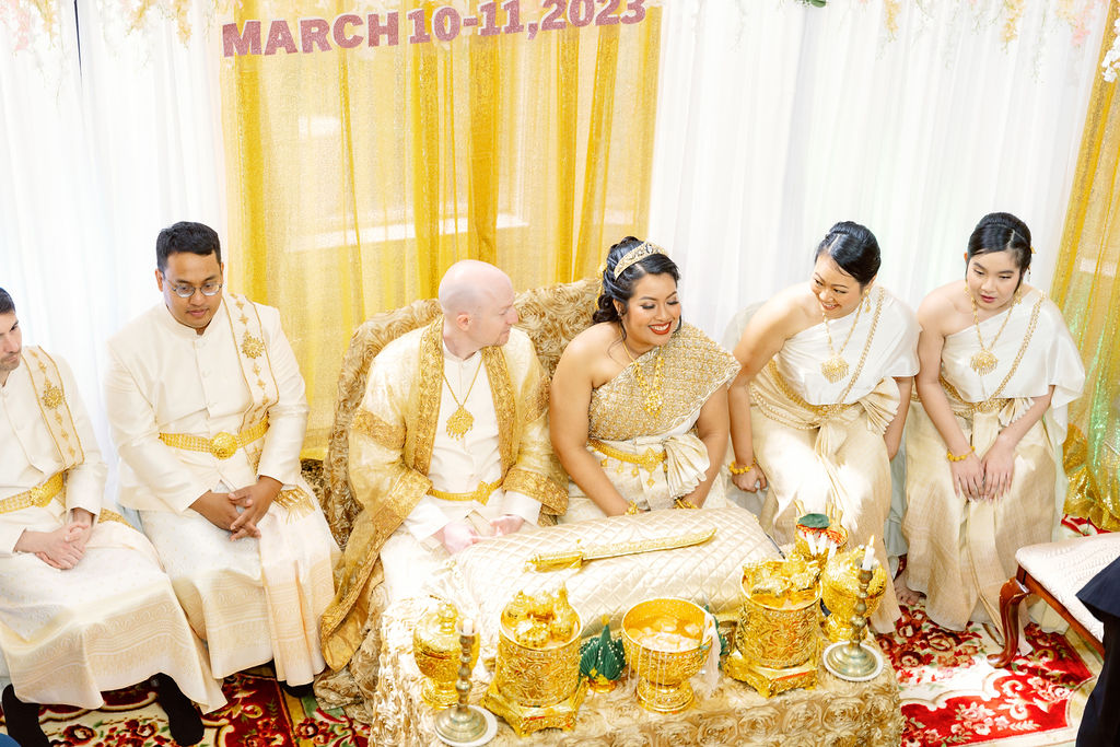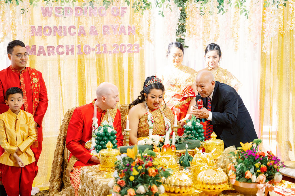 Monica looked absolutely stunning in her traditional Cambodian wedding attire, adorned with intricate gold embellishments and a dazzling headpiece. Ryan complemented her perfectly in a sharp, tailored suit, bringing a modern touch to their cultural celebration.
