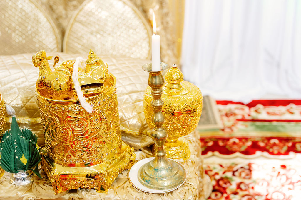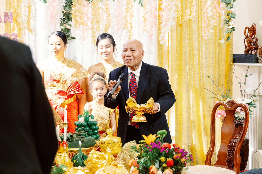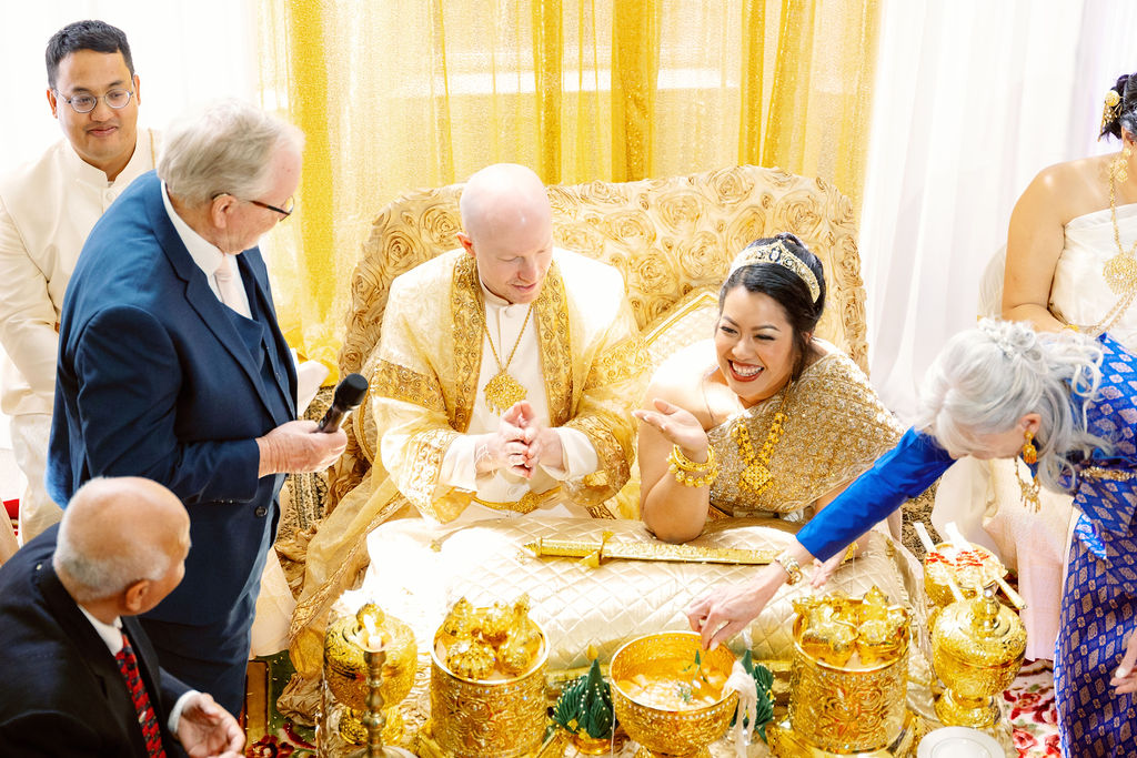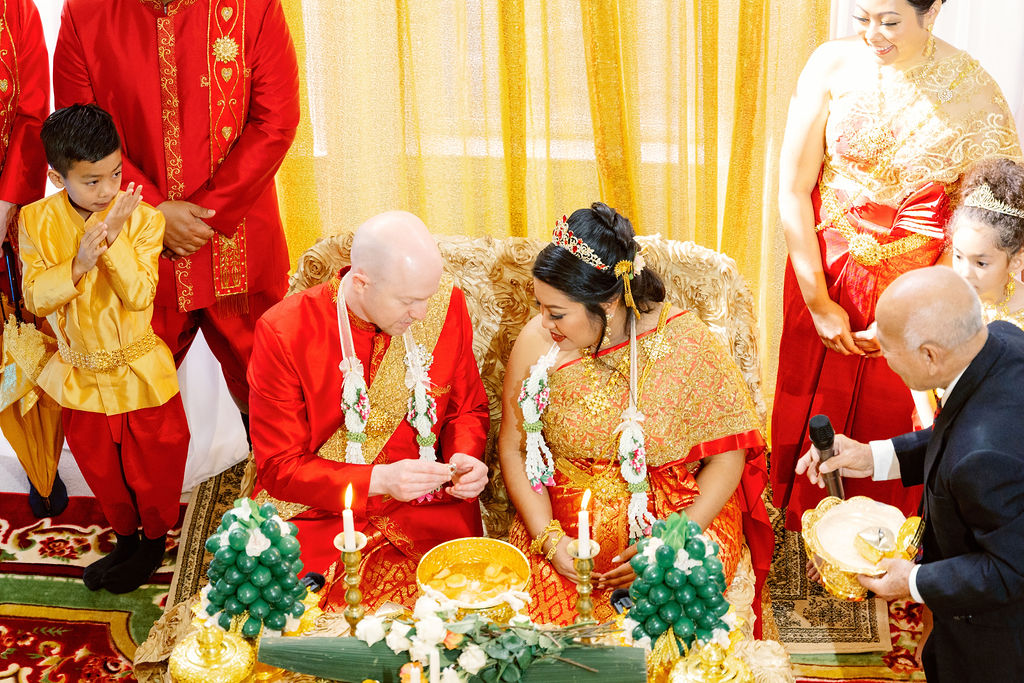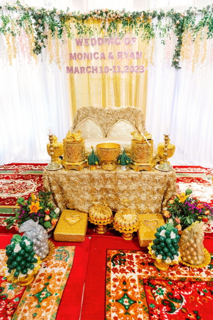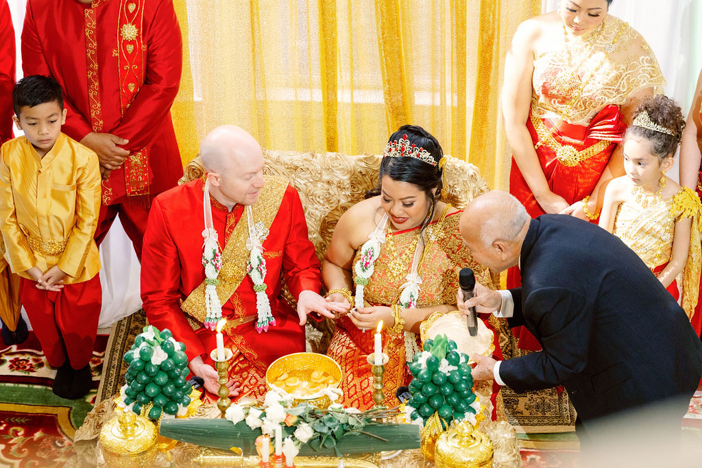 Monica looked absolutely stunning in her traditional Cambodian wedding attire, adorned with intricate gold embellishments and a dazzling headpiece. Ryan complemented her perfectly in a sharp, tailored suit, bringing a modern touch to their cultural celebration.