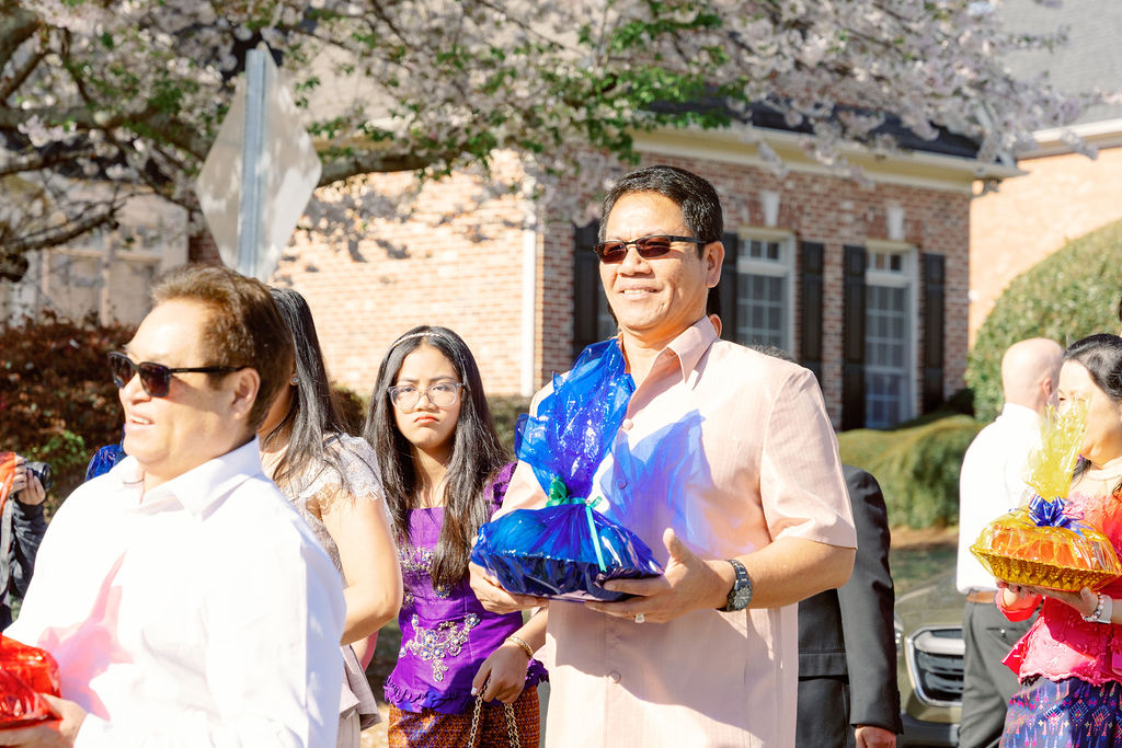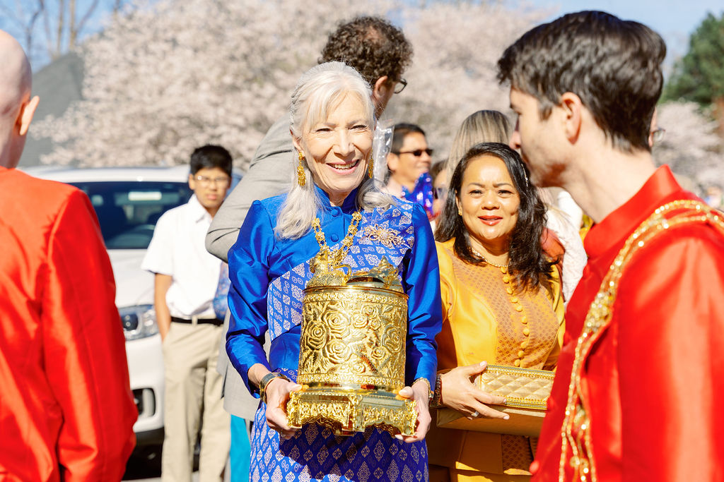 After the ceremony, we captured stunning wedding portraits beneath the cherry blossoms. Laughter filled the air as family and friends celebrated, honoring Cambodian traditions with heartfelt blessings. Moreover, from the golden wedding decor to the intimate family moments, every detail beautifully told a story of love, culture, and unity.