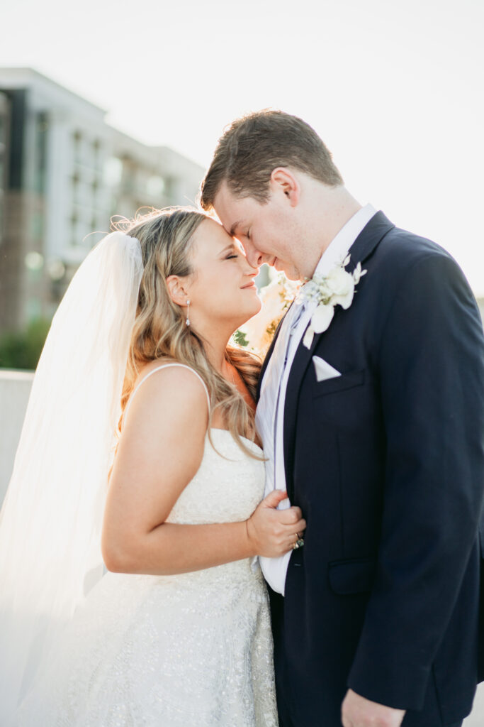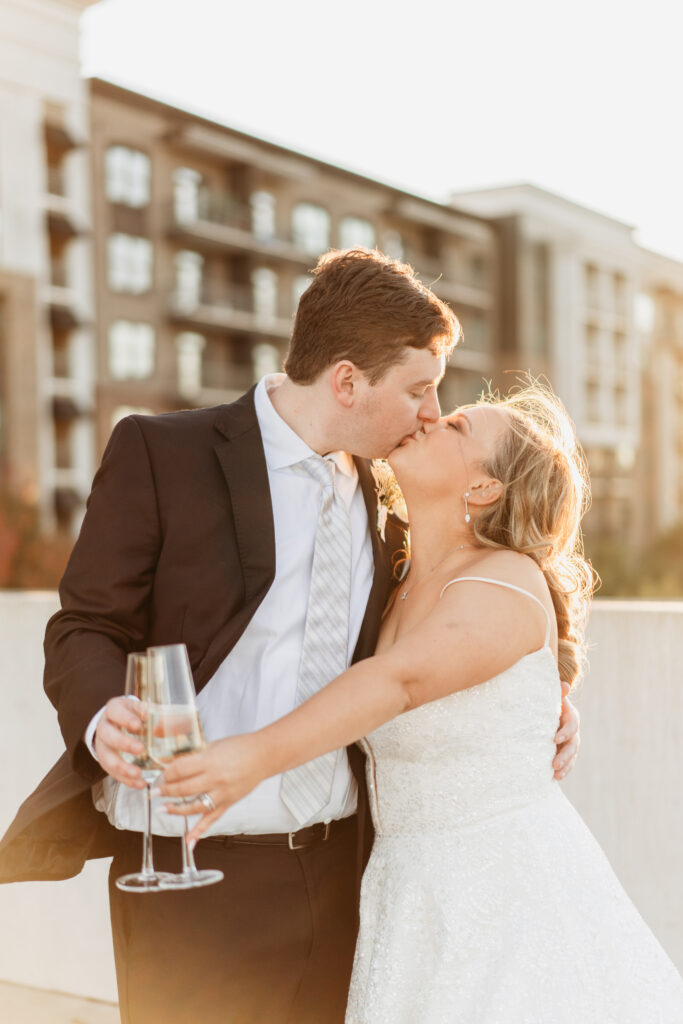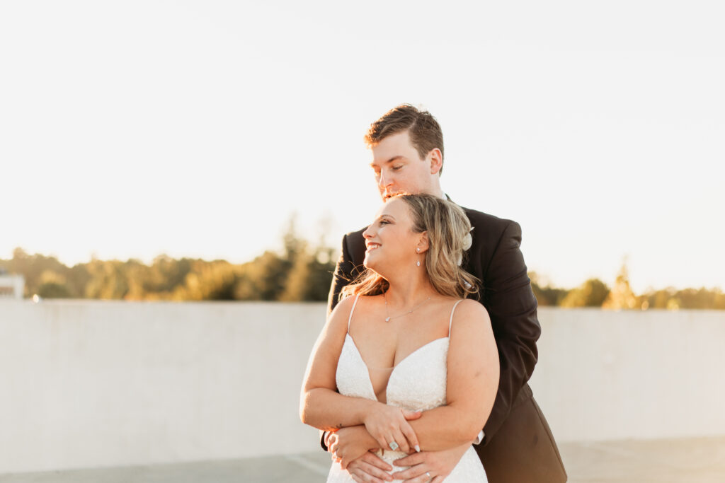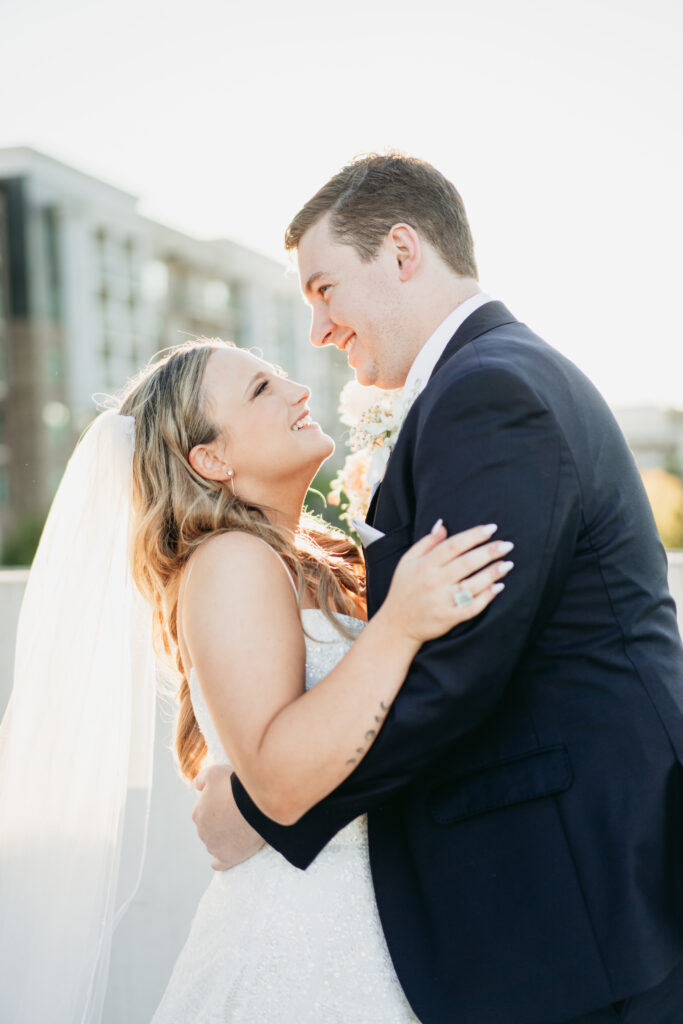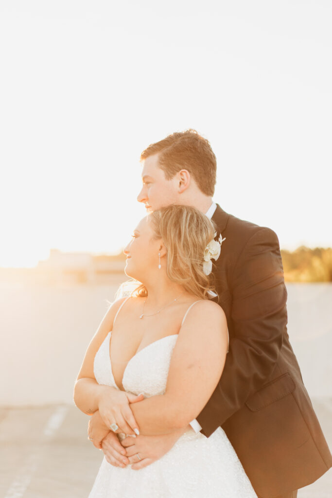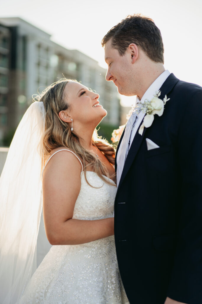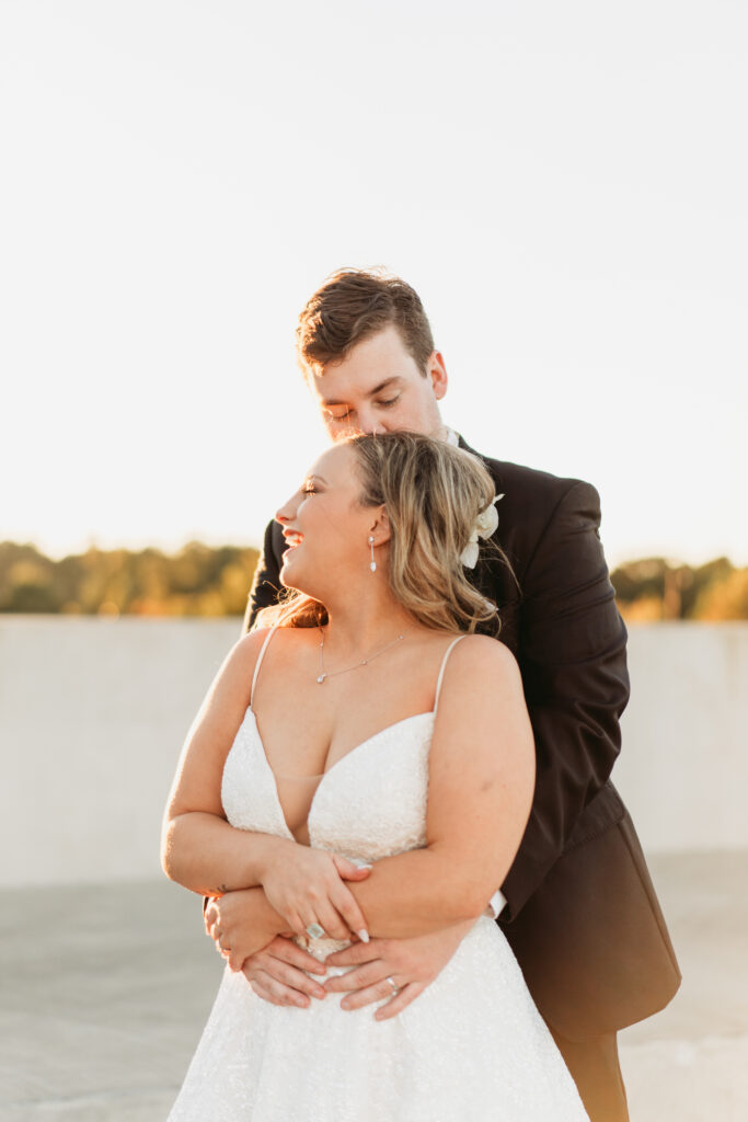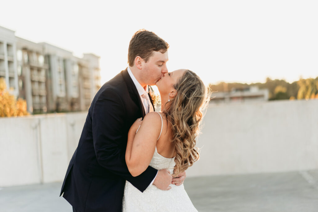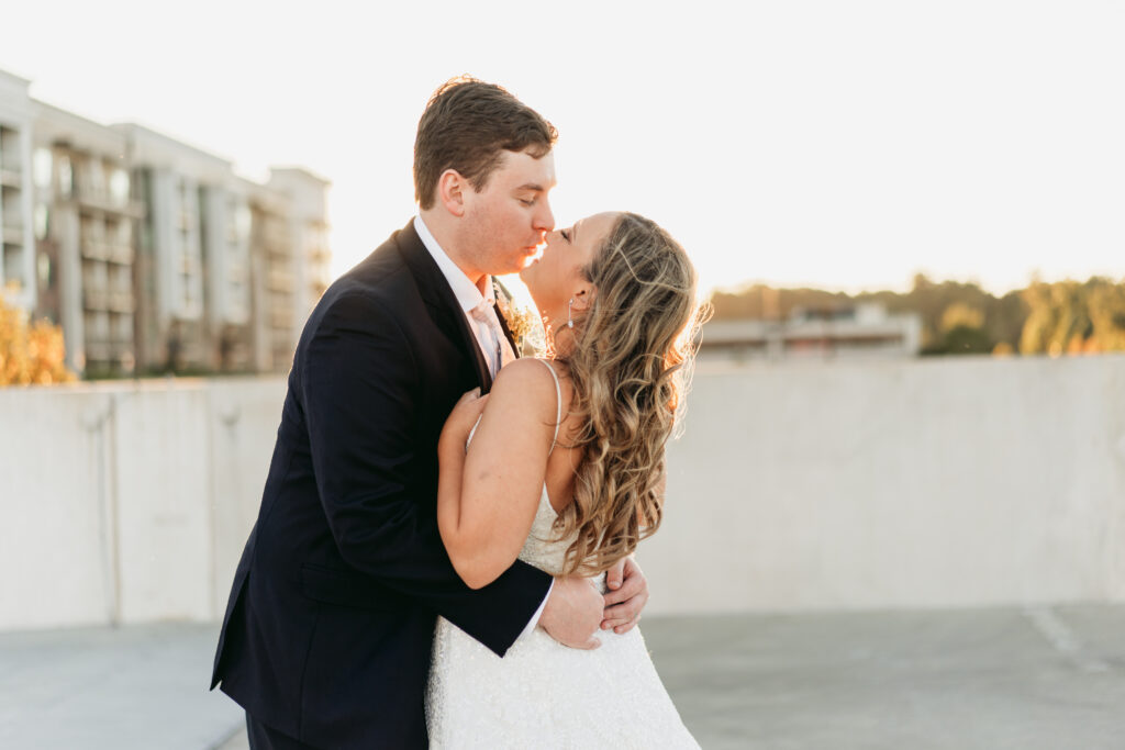 One of the best features of hosting a wedding at Avalon in Alpharetta is the beautiful skyline just steps away. Erin and Dominic stepped outside during golden hour for their rooftop portraits, capturing a mix of soft sunset light and modern city views.