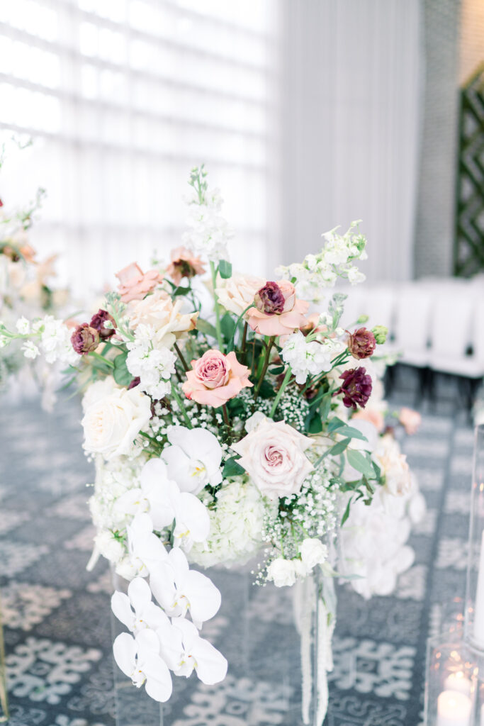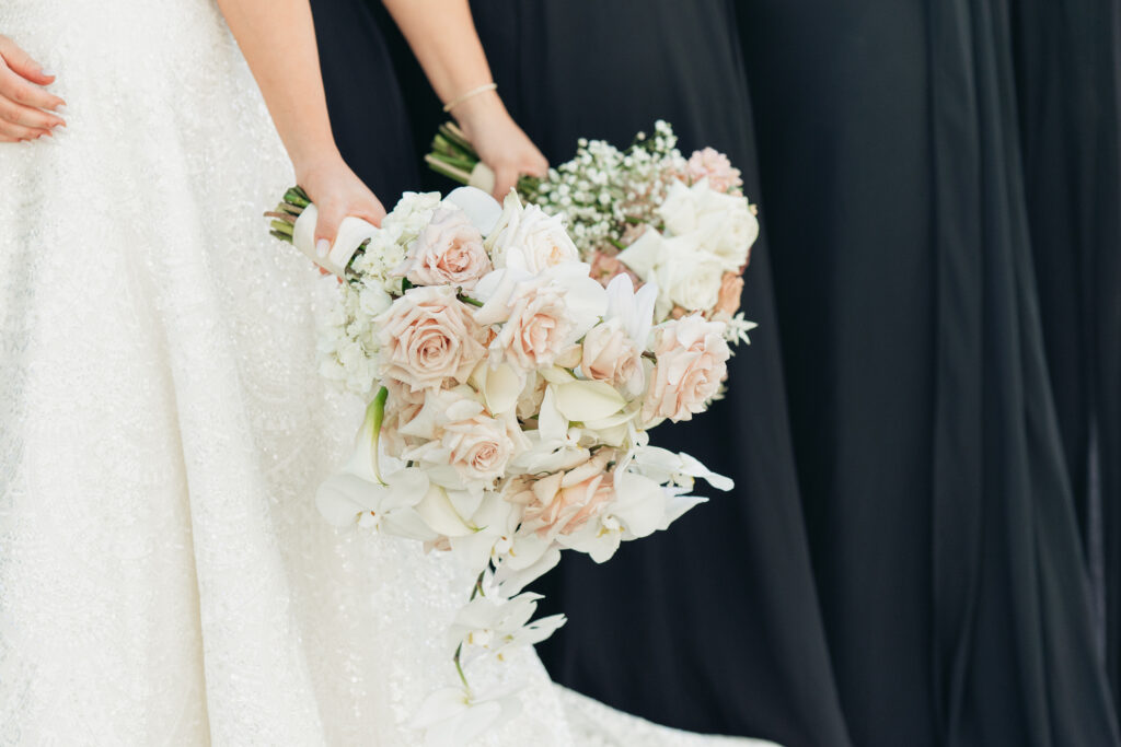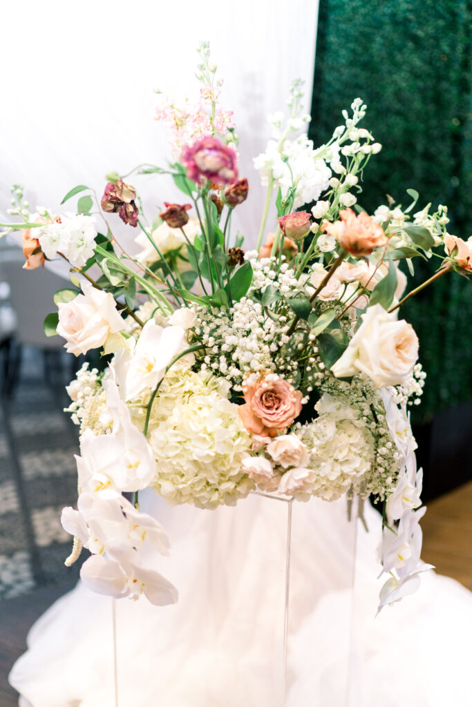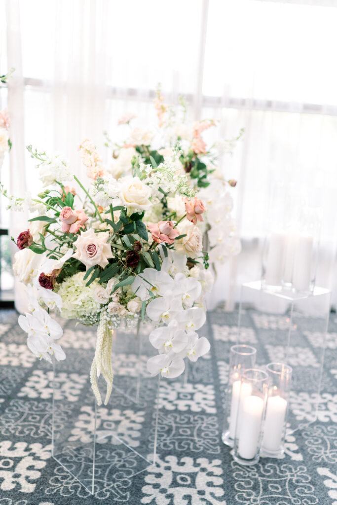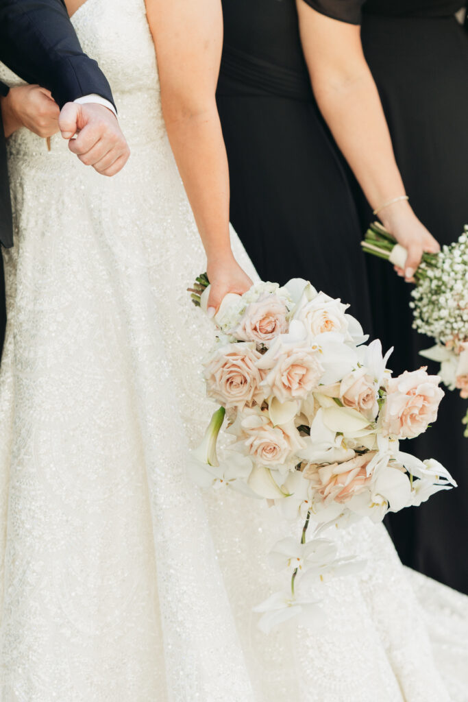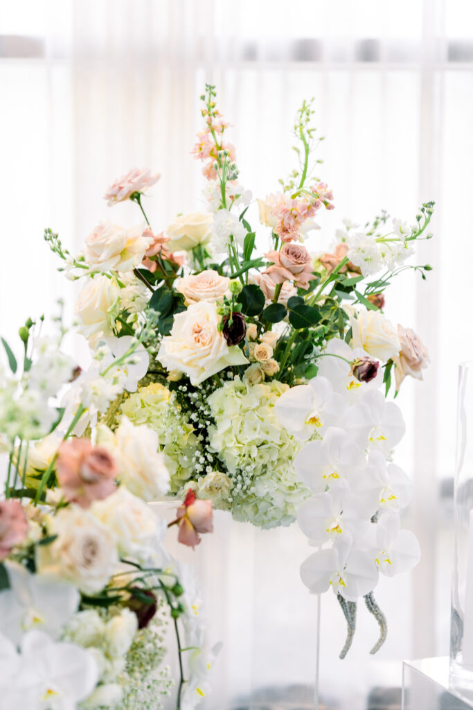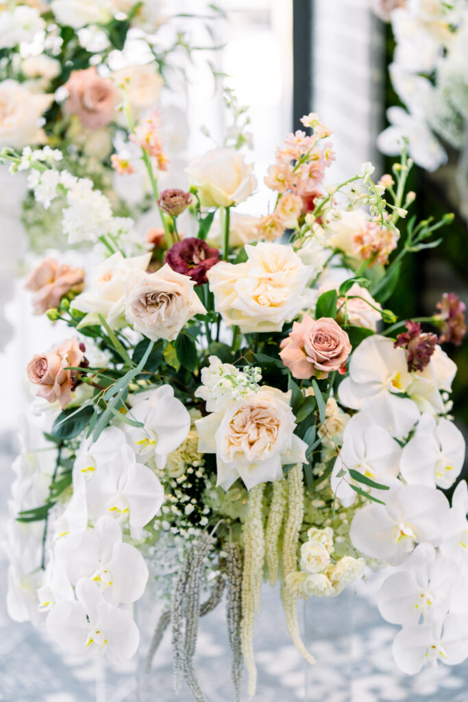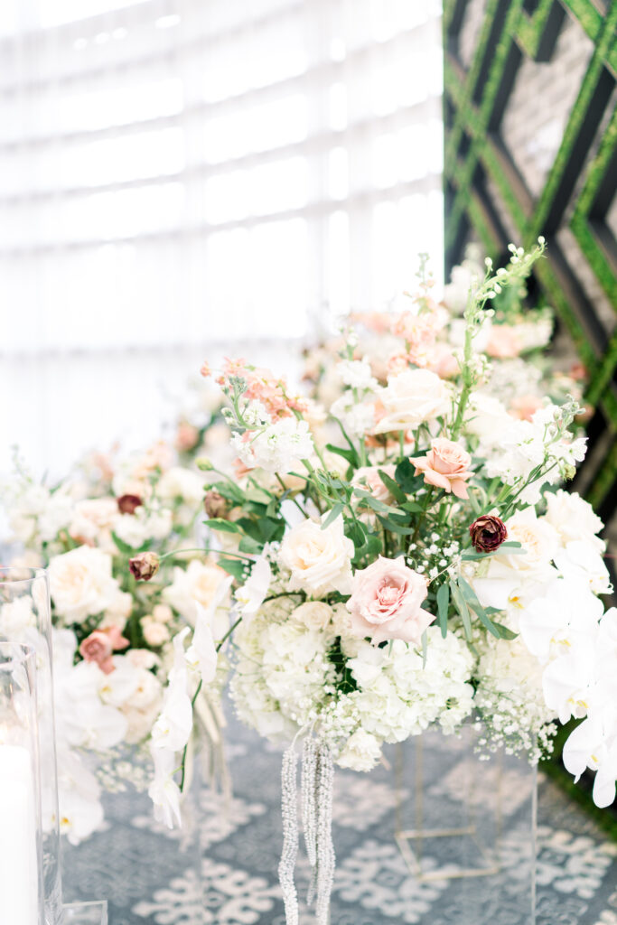 Every detail of this wedding was thoughtfully designed to feel warm, elegant, and refined. Soft blush roses, white orchids, and flowing greenery filled the ceremony and reception spaces, adding texture and romance throughout the day.