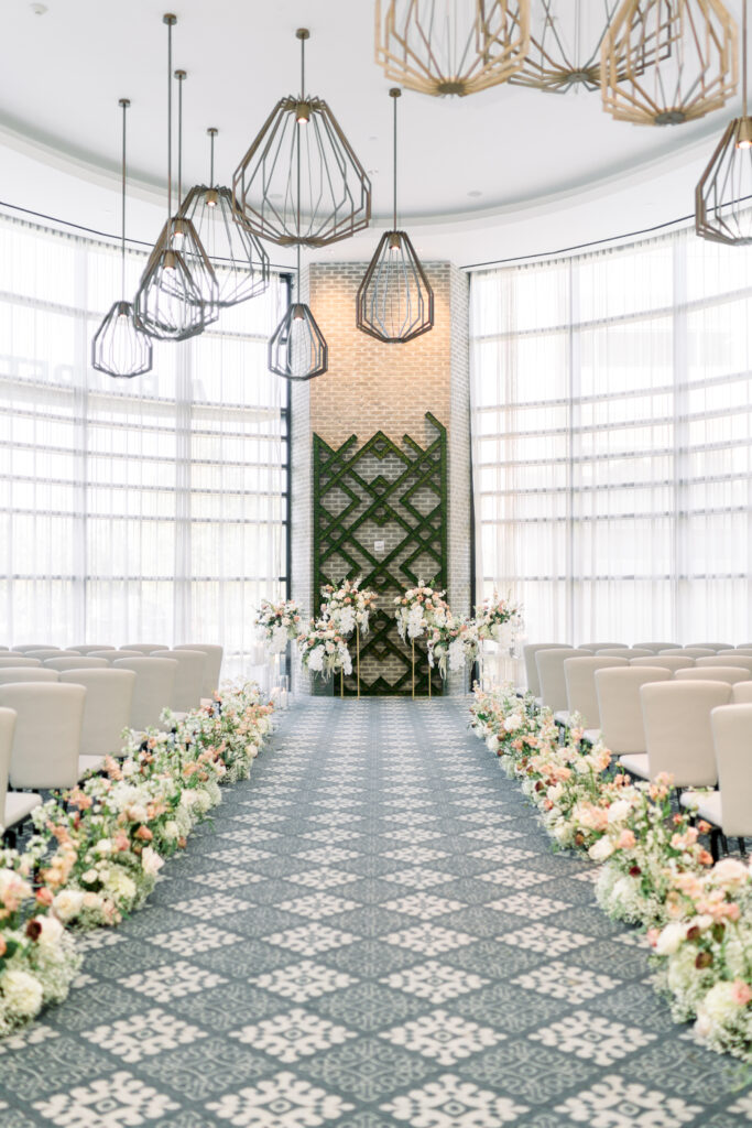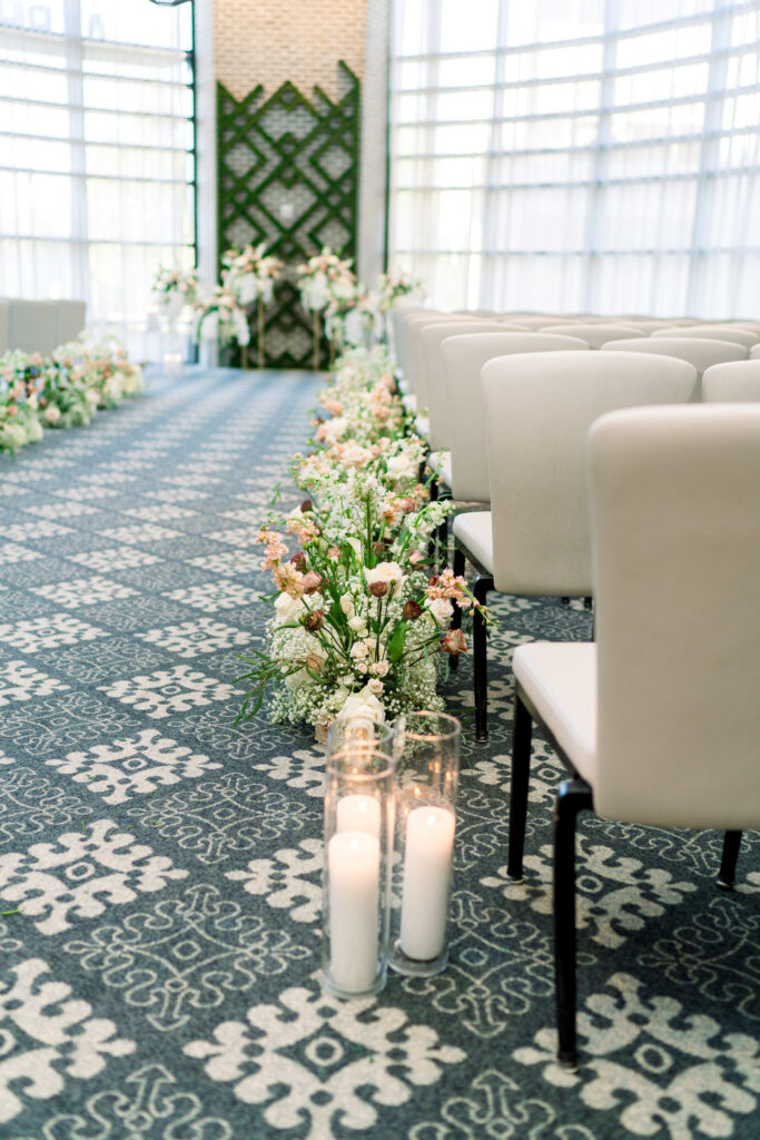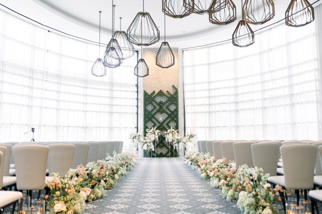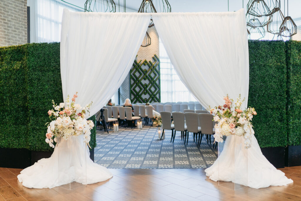 The ceremony was framed by lush floral arrangements. They lined the aisle and a greenery backdrop that perfectly complemented the clean, contemporary design of the room. It was the perfect blend of organic and modern, creating a setting that felt both timeless and fresh.