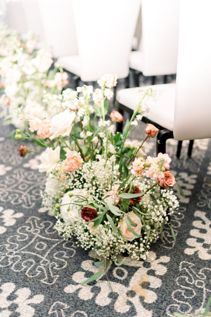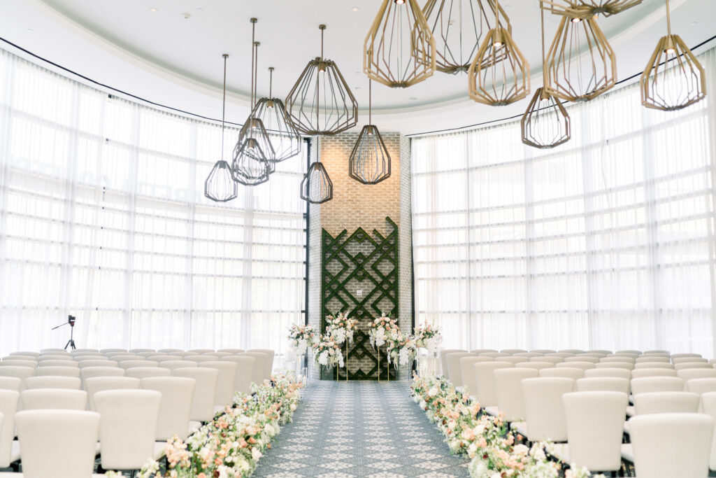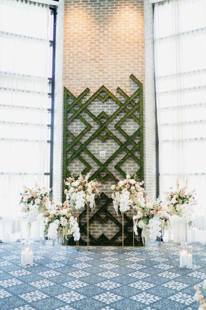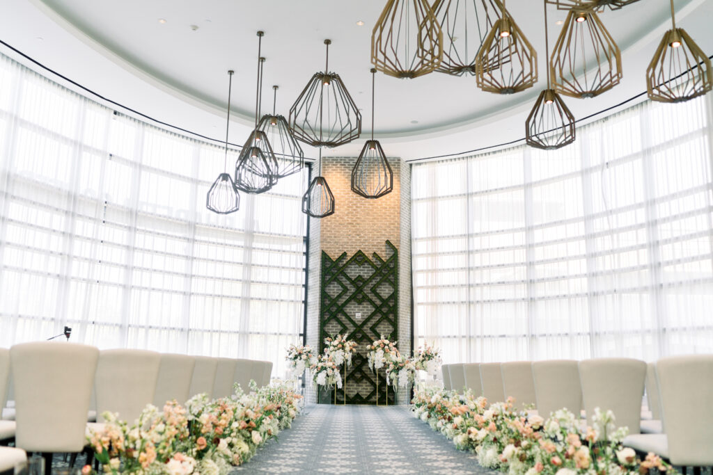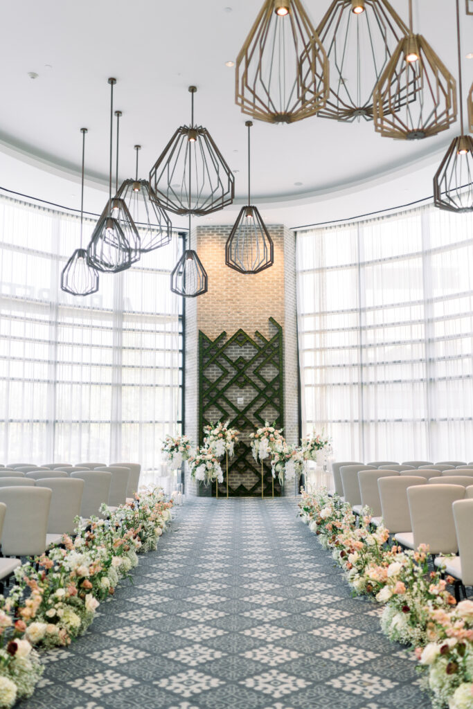 The ceremony was framed by lush floral arrangements. They lined the aisle and a greenery backdrop that perfectly complemented the clean, contemporary design of the room. It was the perfect blend of organic and modern, creating a setting that felt both timeless and fresh.