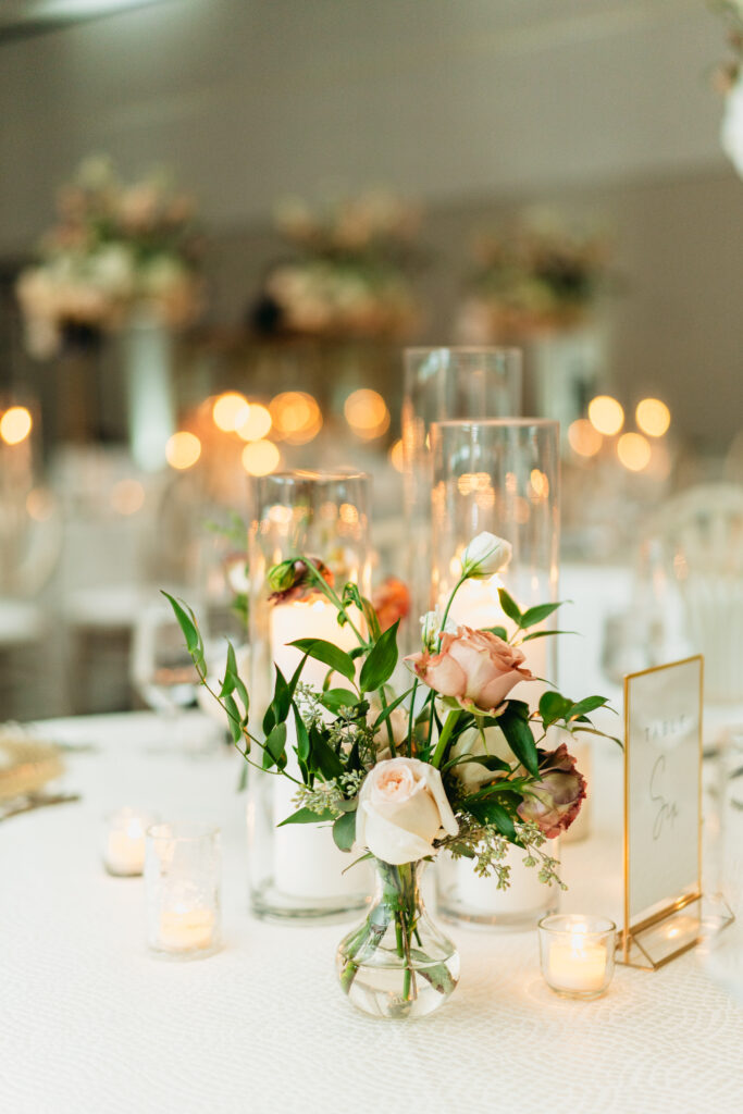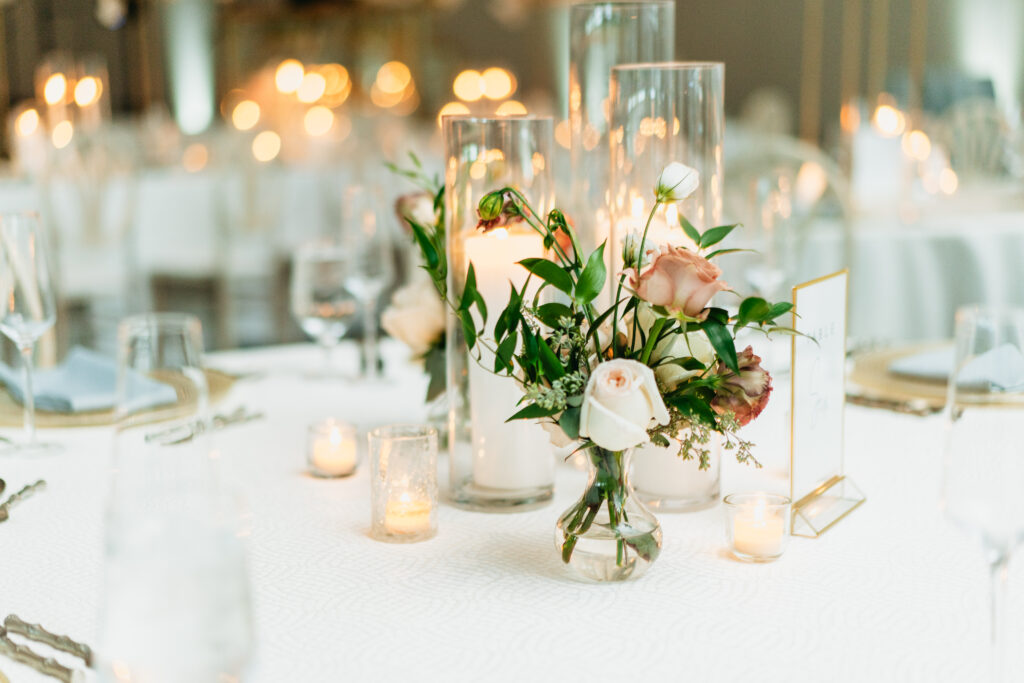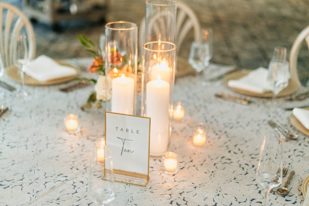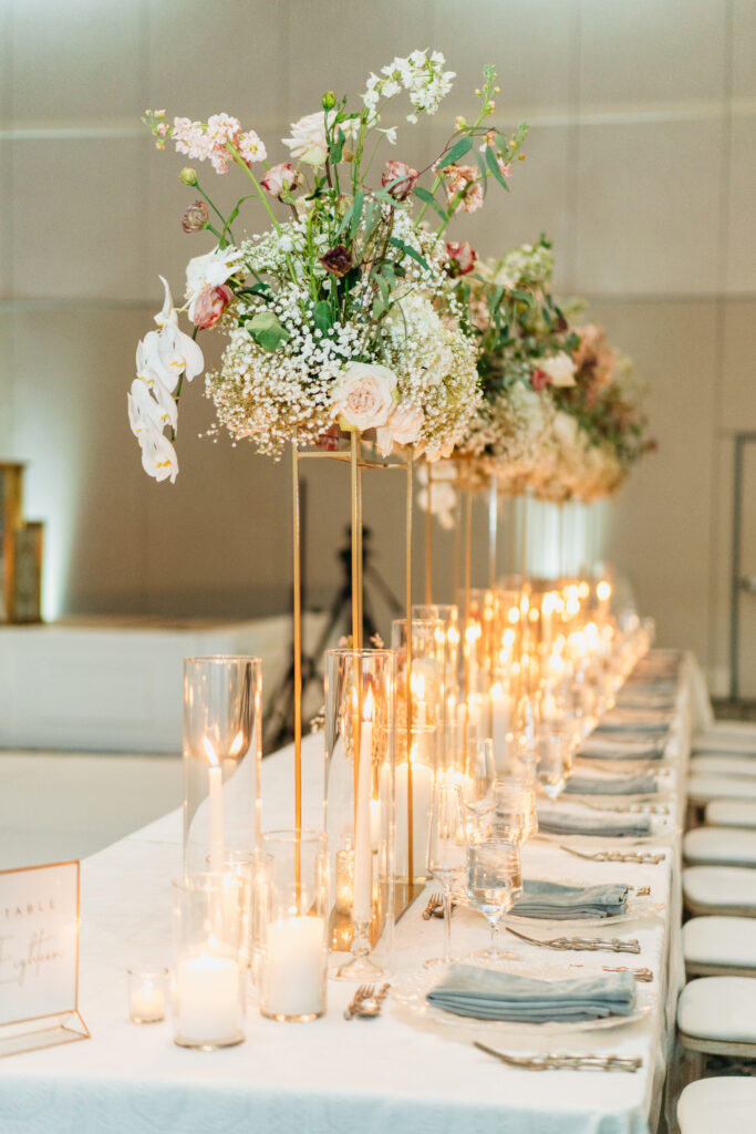 As the evening unfolded, the reception space came alive with candlelight, creating an intimate atmosphere for dinner, speeches, and dancing. Hundreds of candles and towering floral centerpieces filled the room. The space felt cozy yet luxurious for every guest.