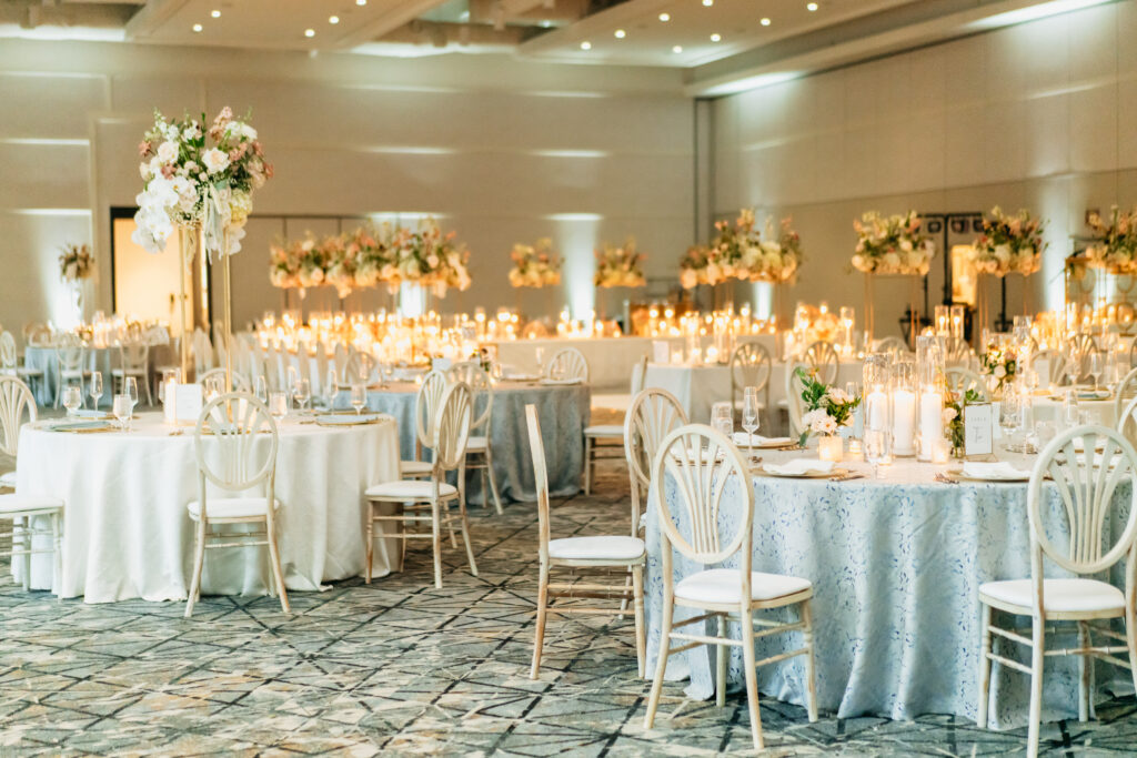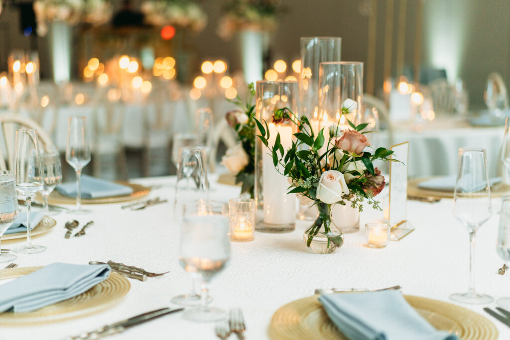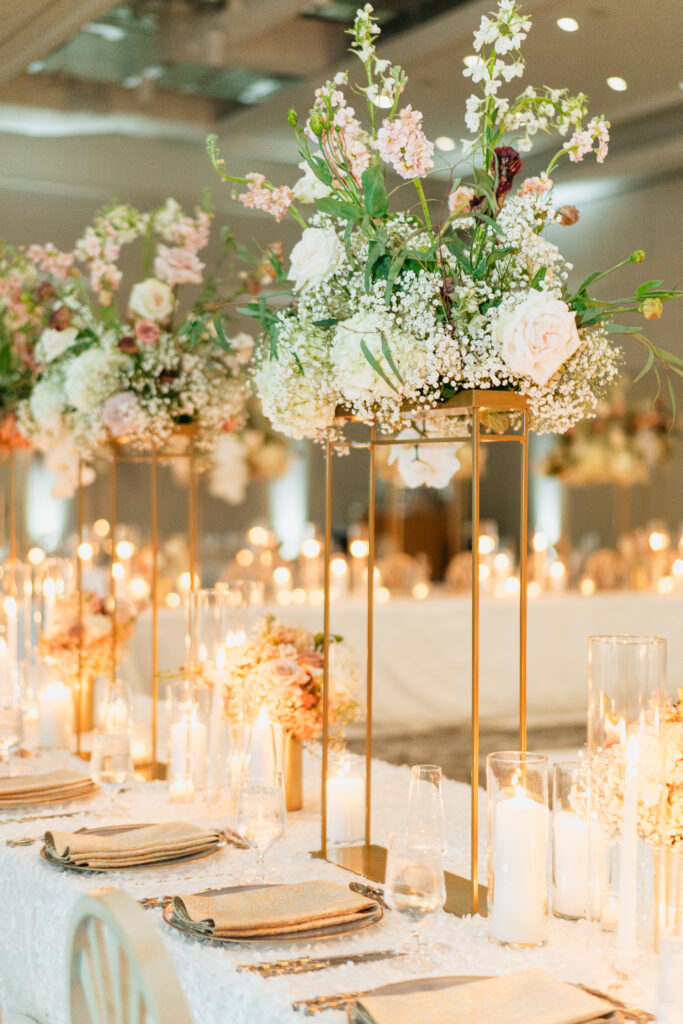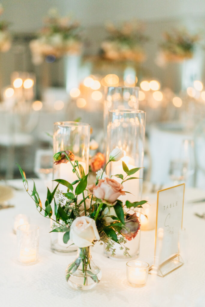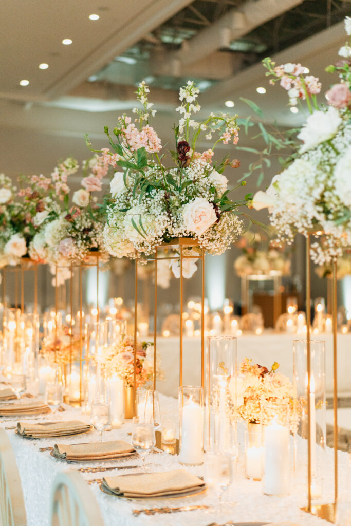 As the evening unfolded, the reception space came alive with candlelight, creating an intimate atmosphere for dinner, speeches, and dancing. Hundreds of candles and towering floral centerpieces filled the room. The space felt cozy yet luxurious for every guest.