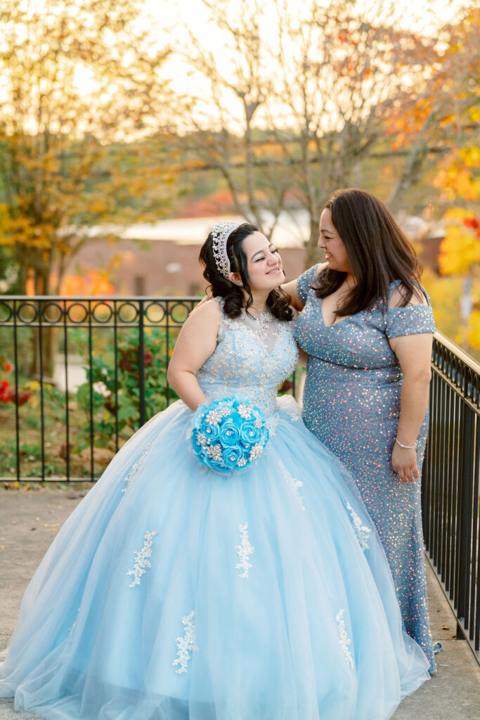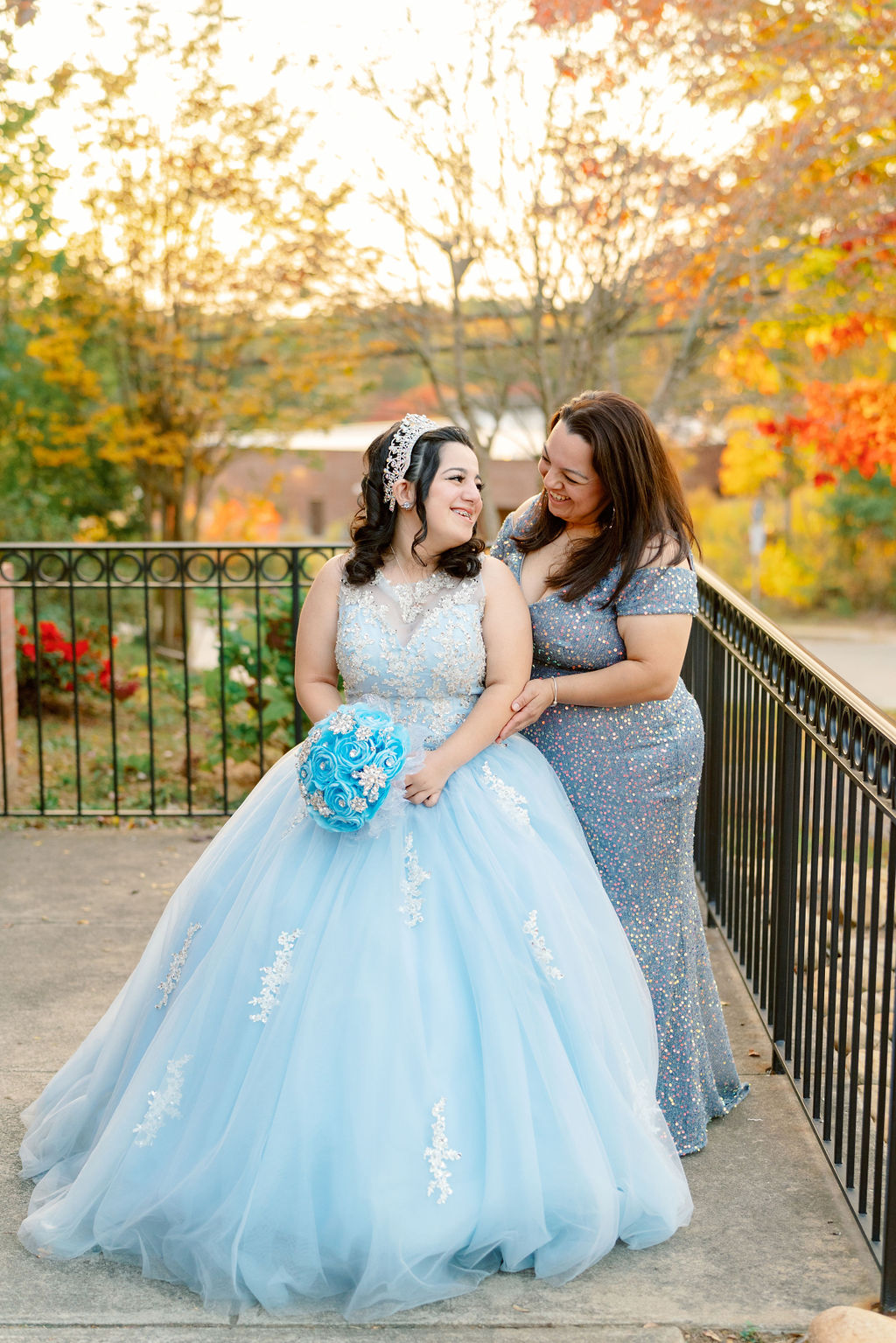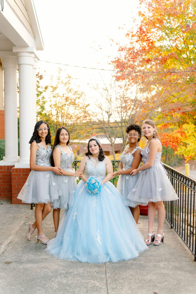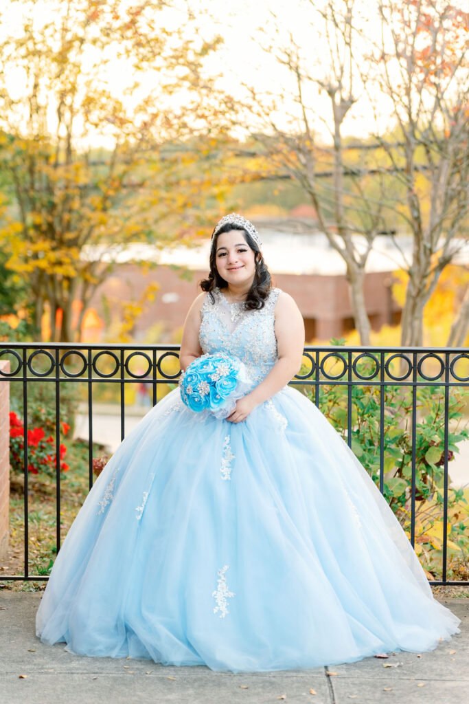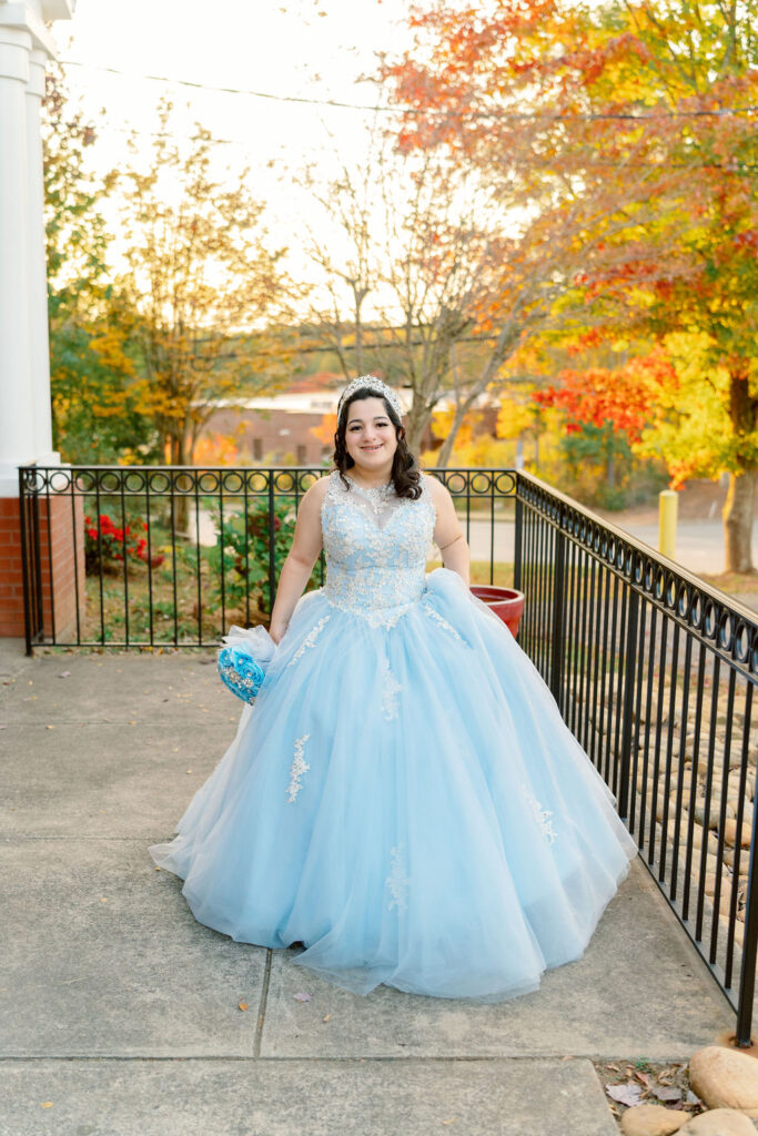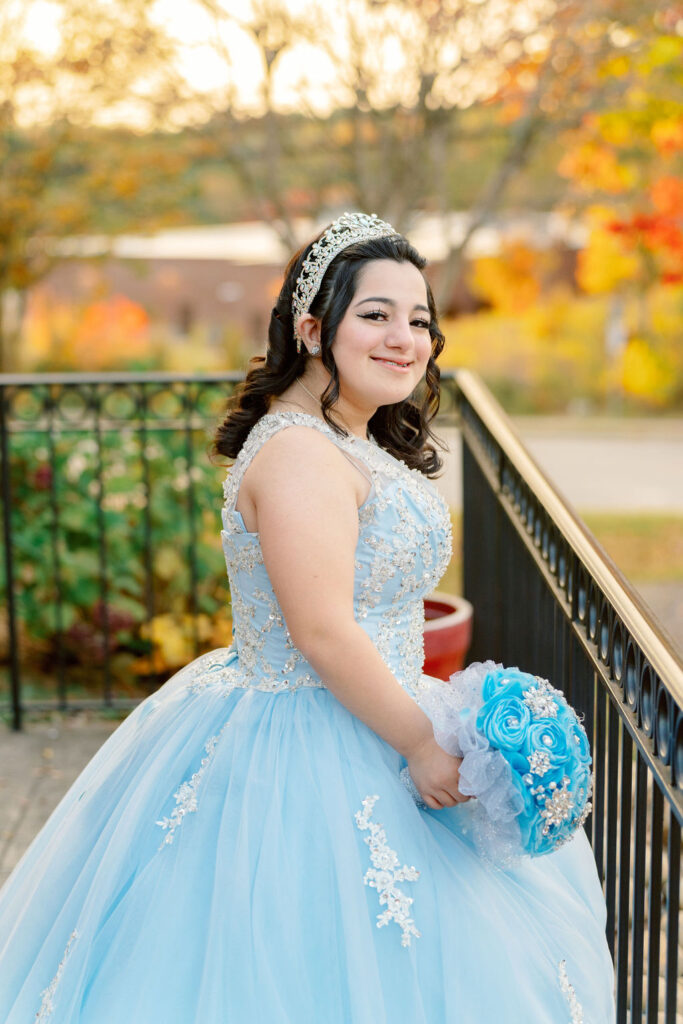 Finding beauty in unexpected places is one of the best parts of quinceañera photography. With the right lighting and composition, we created a scene worthy of a fairytale. The colorful fall leaves framed Dani perfectly, while her soft blue dress drew attention to her elegant presence.