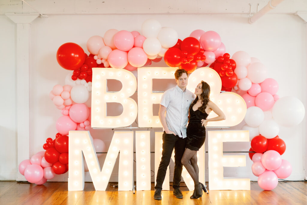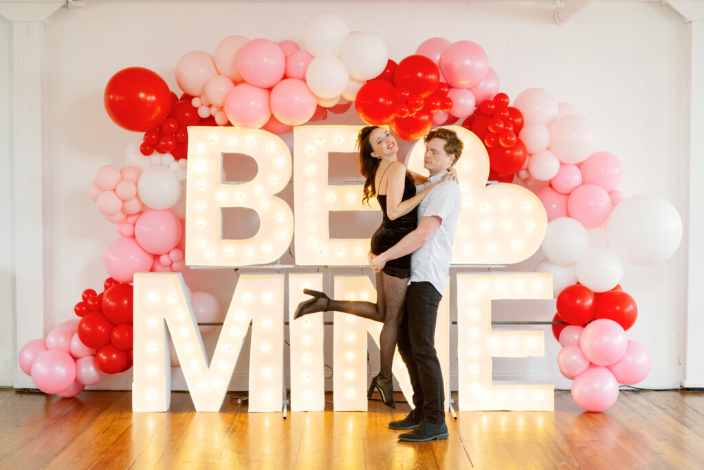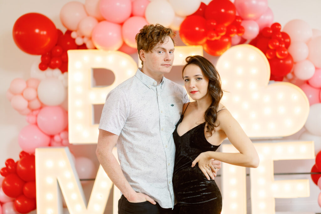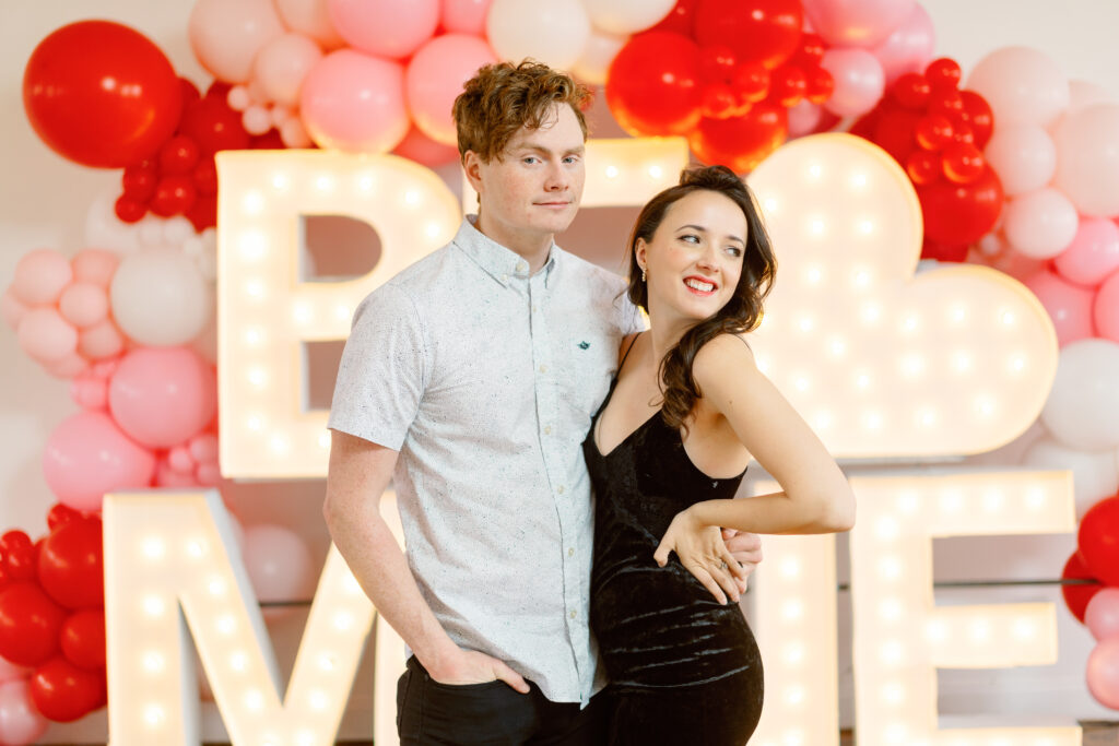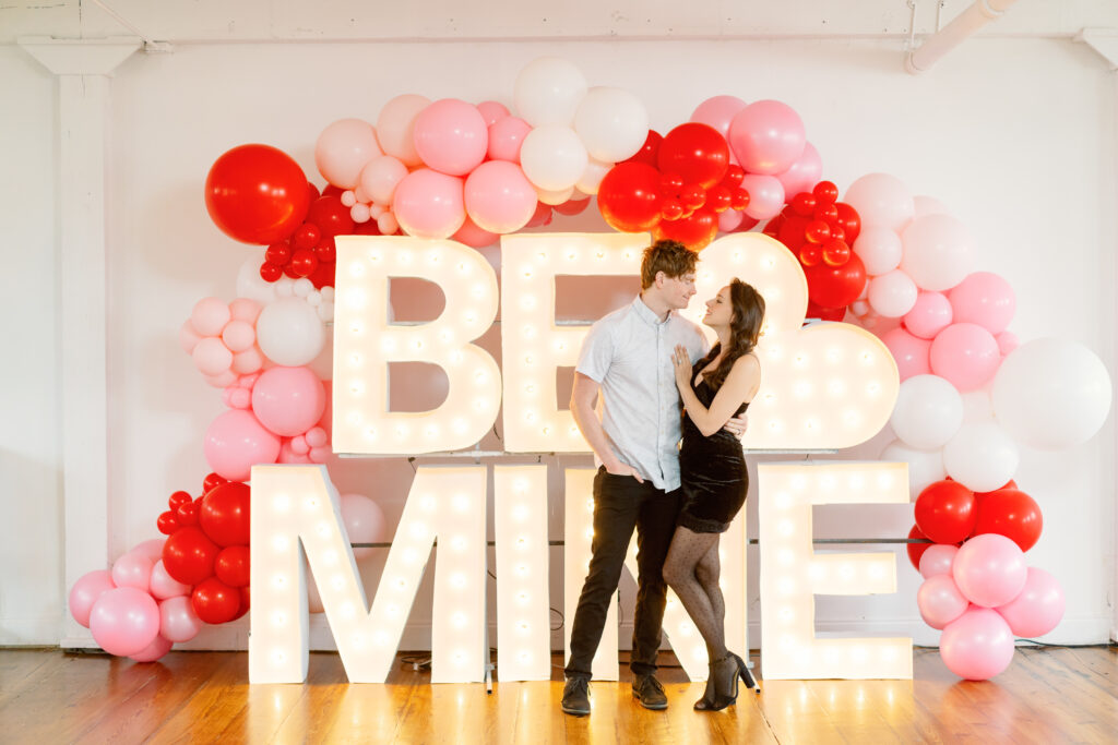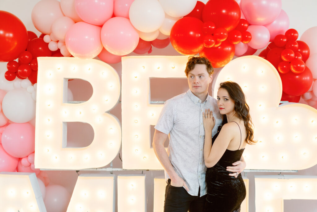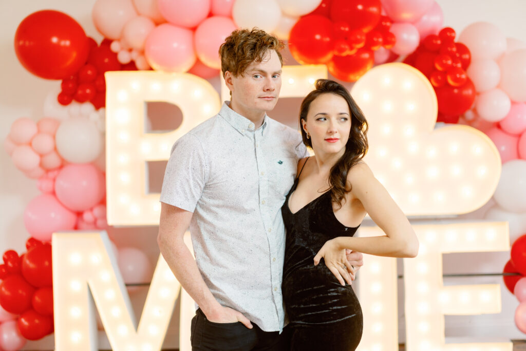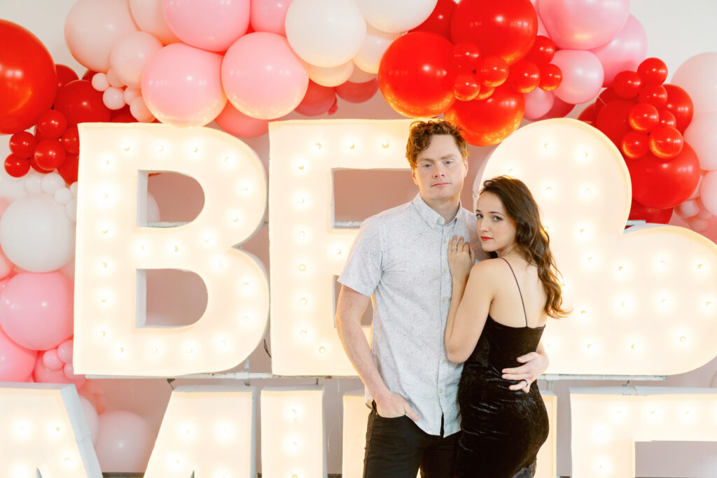 Rachael & Caleb wanted photos that felt fun, connected, and a little bold, while still keeping things timeless. We leaned into the studio environment and created a playful setup using a vibrant balloon installation paired with oversized marquee letters.