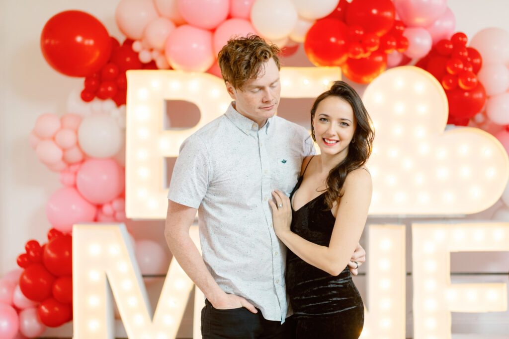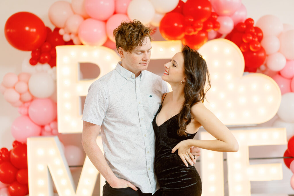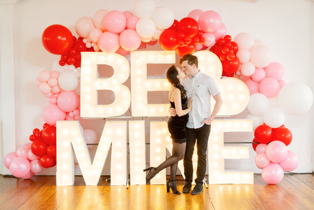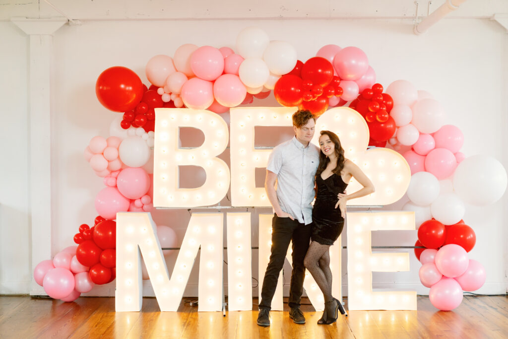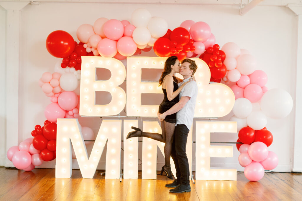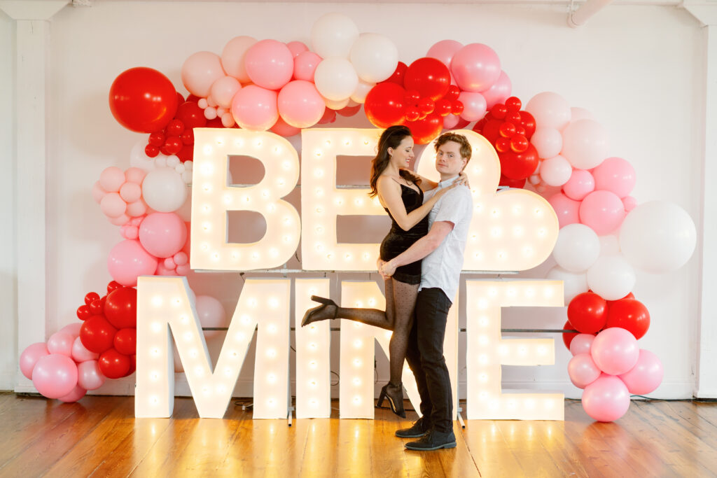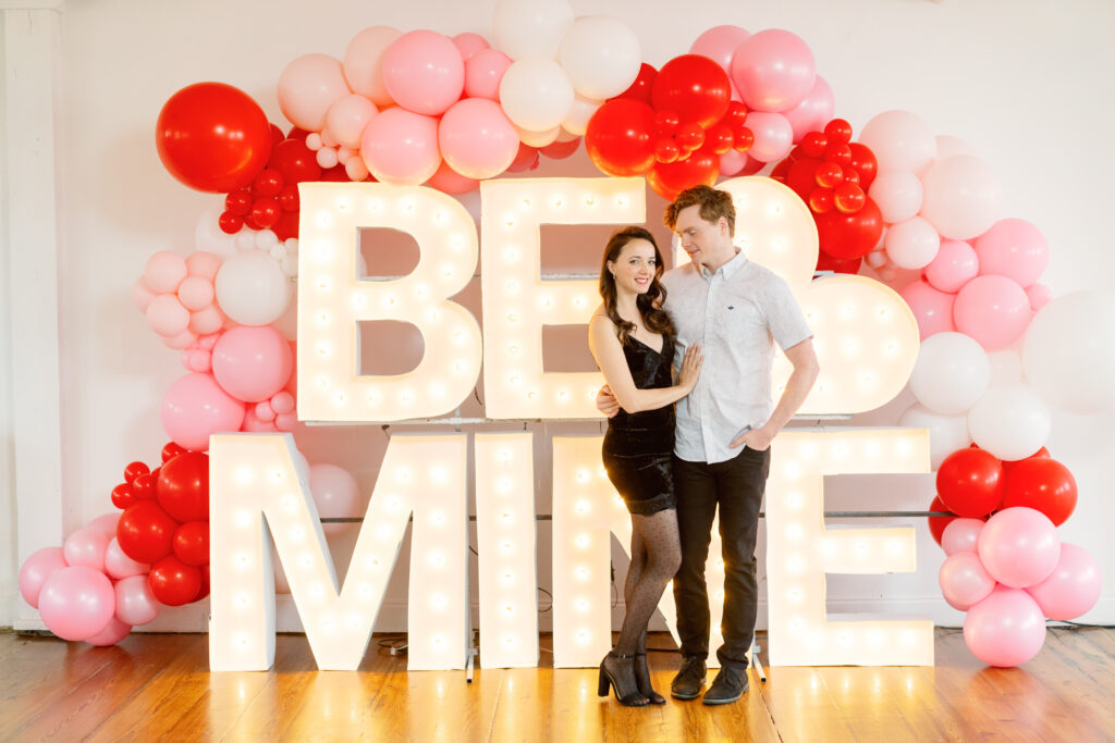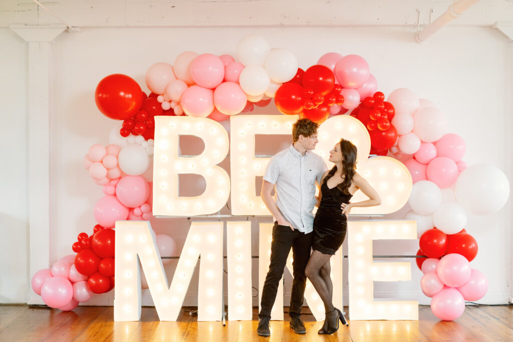 Rachael & Caleb wanted photos that felt fun, connected, and a little bold, while still keeping things timeless. We leaned into the studio environment and created a playful setup using a vibrant balloon installation paired with oversized marquee letters.